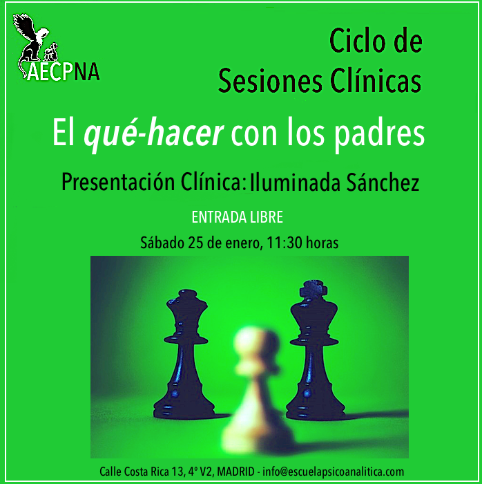 25 Enero. Ciclo de Sesiones Clínicas: «El qué-hacer con los padres» a cargo de Iluminada Sánchez. Hora: 20:30h. Entrada libre. Lugar: C/Costa Rica 13, 4ºIzda V2.