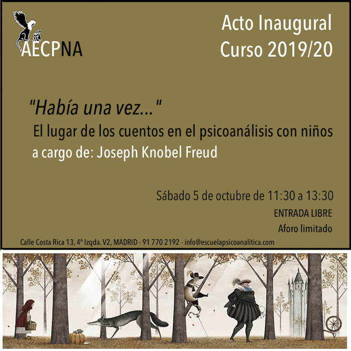 5 Octubre. Acto inaugural curso 2019-2020 a cargo de Joseph Knobel Freud «Había una vez…» El lugar de los cuentos en el psicoanálisis con niños. Hora: 11:30h-13:30h. Lugar:  C/Costa Rica 13, 4ºIzda V2. Entrada libre. Aforo limitado.