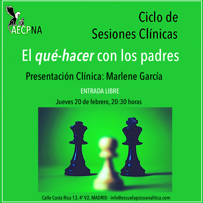 20 Febrero. Ciclo de Sesiones Clínicas: «El qué-hacer con los padres» a cargo de Marlene Garcia. Hora: 20:30h. Entrada libre. Lugar: C/Costa Rica 13, 4ºIzda V2.