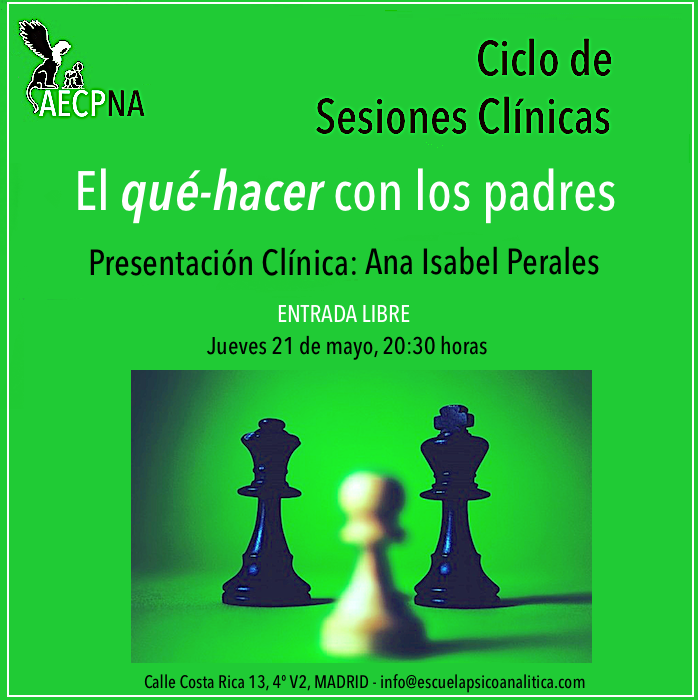 21 Mayo. Ciclo de Sesiones Clínicas: «El qué-hacer con los padres» a cargo de Ana Isabel Perales. Hora: 20:30h. Entrada libre. Lugar: C/Costa Rica 13, 4ºIzda V2.