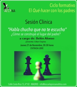 21 Noviembre. Ciclo formativo de Sesiones Clínicas: «El qué-hacer con los padres» a cargo de Belén Alonso.  «Habla chucho que no te escucho. ¿Cómo se construye el lugar del padre?» Hora: 20:30h. Entrada libre. Lugar: C/Costa Rica 13, 4ºIzda V2.